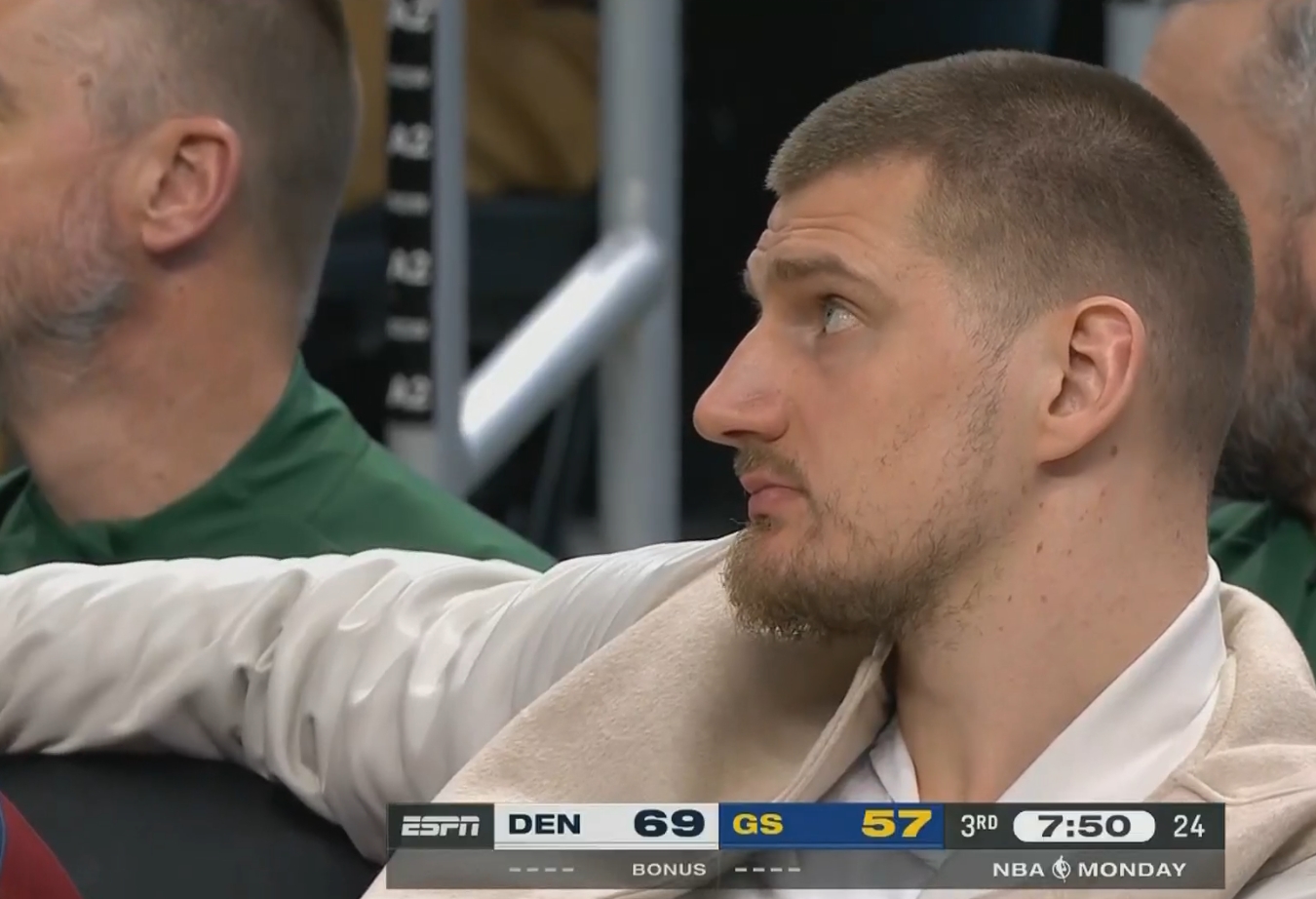 舒服~残阵掘金领先勇士两位数 场下的约基奇一脸淡定~