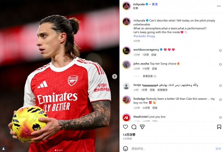 他也在赛后通过社媒晒出比赛照,并配文:“今天在球场上的感受简直无法形容,太不可思议了!”