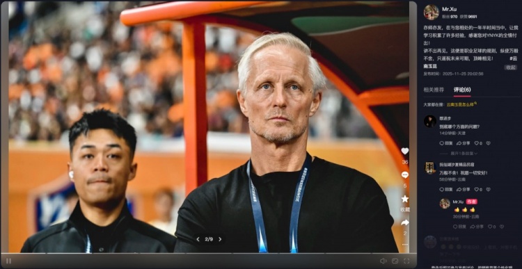 11月25日讯 结束2025赛季,云南玉昆的主教练约恩·安德森也将卸任。今天晚间,玉昆俱乐部副总经理徐枭更新社交账号,向约恩·安德森道别。